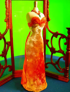 Hello everyone and thanks to all my followers for leaving comments and reading my blog. You are the best of the best helping me keep my self- respect! I know my minis are not the best in the world, but, as a cancer survivor, a lovely quote from Sharon Olds is inspirational: "Writing or making anything—a poem, a bird feeder, a chocolate cake—has self-respect in it. You're working. You're trying. You're not lying down on the ground, having given up." You are my motivation for posting and offering give a ways. See details below on how to win this fabulous 1 inch scale dress from my Jared Collection. It is made on a hanger (cannot be worn by doll) from gorgeous paper backed fabric. How did I create this tiny beauty? According to Martha Beck's quote below this is how: